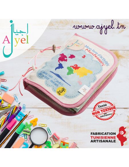 كتاب من القماش يحتوي على الكثير من الأنشطة المستوحاة من طريقة مونتيسوري، الممتعة والتعليمية على حد سواء، لمساعدة طفلك على التعلم. إنه كتاب عملي ولا يشغل مساحة كبيرة، لذا يمكنك اصطحابه معك أينما ذهبت (في الرحلات، في السيارة، إلخ).