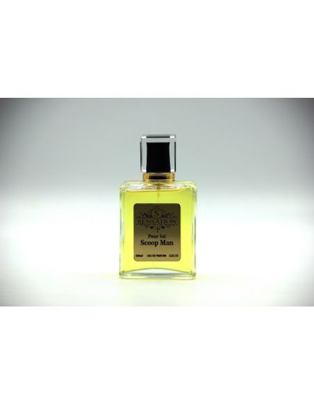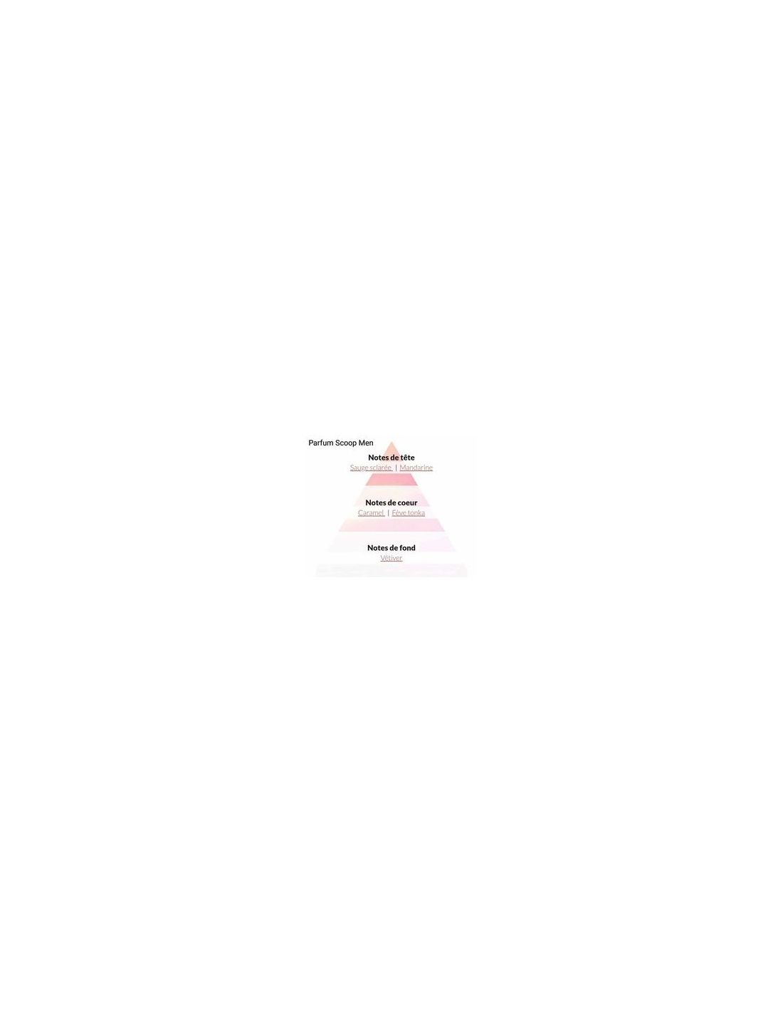 Boisé et oriental, Scoop Men s'articule autour d'une senteur gourmande et sucrée de caramel. Celle-ci s'adoucit de fève tonka, plus onctueuse, tout en se mêlant à l'odeur plus insolite de la sauge. Aromatique et rafraîchissante, cette dernière est relayée par du vétiver en son fond, pour plus de persistance et une ultime saveur boisée. Scoop Men est un parfum qui ne passe pas inaperçu. Il affiche une élégance musclée et se destine à un homme ambitieux, couronné de victoires.