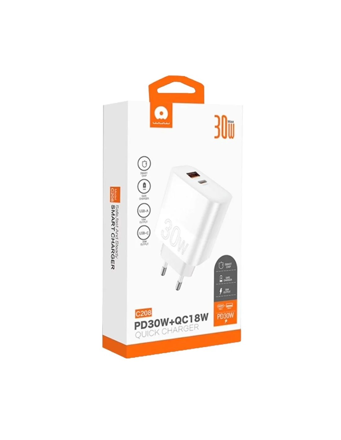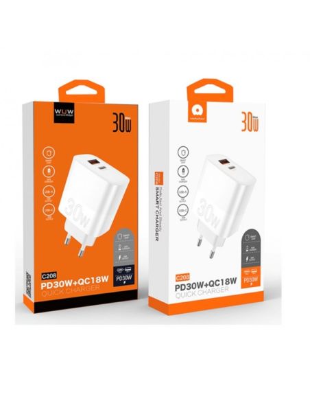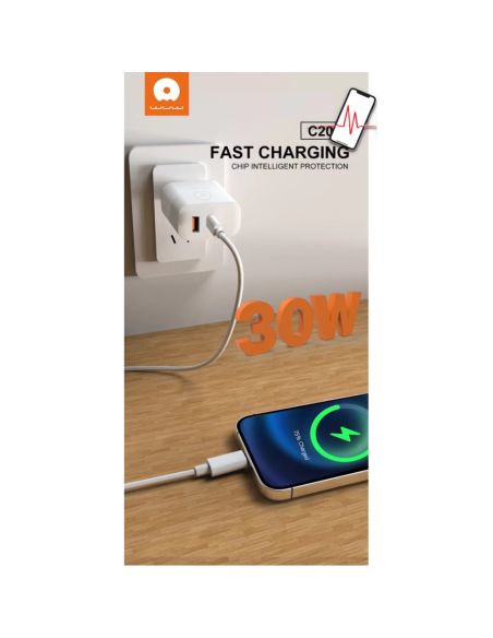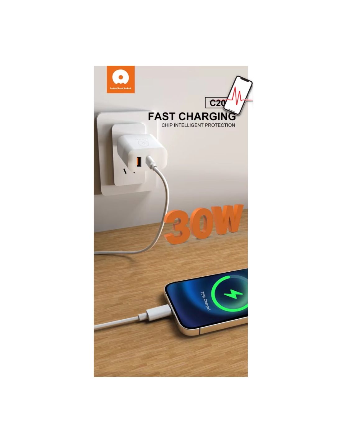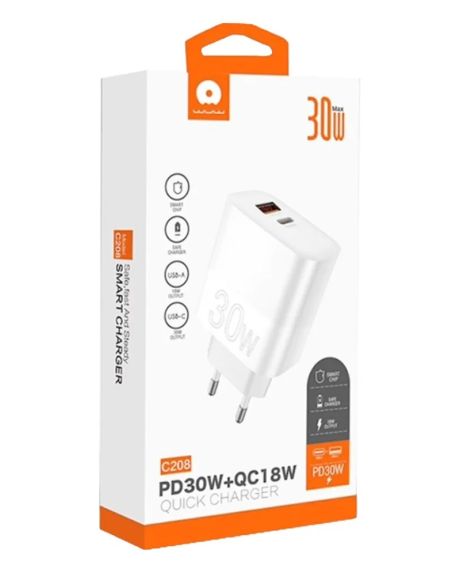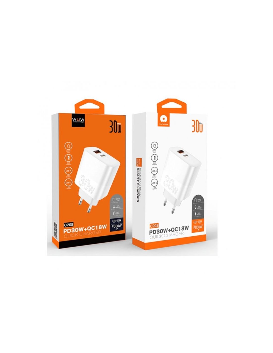 WUW C208 Chargeur mural, sortie USB-A30W + Type C, Prise UE, prise en charge des protocoles de charge Rapide. grâce auquel vous pouvez charger deux gadgets en même temps. Le système de protection intégré à plusieurs niveaux contre les surtensions et les courts-circuits rend l'utilisation de la charge absolument sûre et élimine également la possibilité de surcharger les gadgets rechargeables. L'accessoire est compatible avec la plupart des appareils mobiles existants. En l'utilisant, vous pouvez être absolument sûr de sa qualité et de la sécurité de vos appareils.Le chargeur WUW-C208 est équipé d’un port d’alimentation USB-C et d’un port de charge rapide USB-A. 30W PD USB-C + USB QC3.0 18W Il prend en charge la plupart des protocoles de charge : 3.0, QC 3.0/2, FCP, AFC, de sorte que vous pouvez charger rapidement deux appareils, tels que le téléphone portable et la tablette, en même temps. DISTRIBUTION INTELLIGENTE DE L’ÉNERGIE Le chargeur WUW-C208 offre une puissance maximale de 30W (USB-A – 18 W, USB-C – 30 W) et vous aide à travailler efficacement et de manière flexible. FIABLE ET COMPACT Le chargeur WUW-C208 avec système de protection intégré peut protéger l’appareil connecté contre les courts-circuits, les surchauffes, les surintensités.Le chargeur mural WUW C208 est un adaptateur de haute qualité qui deviendra un assistant fiable dans la charge rapide et sûre de vos appareils. D’une puissance totale de 30W, ce chargeur offre aux utilisateurs deux sorties : l’une USB Type-C avec prise en charge USB Power Delivery, et l’autre USB Type-A compatible avec Quick Charge 3.0. Cette combinaison fait du WUW C208 un choix idéal pour charger les smartphones et les tablettes modernes.