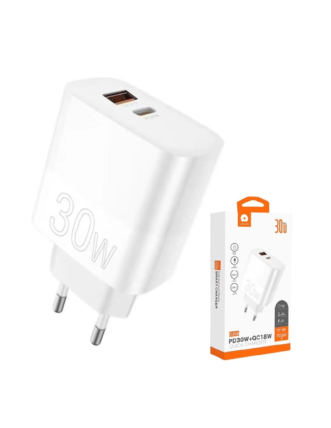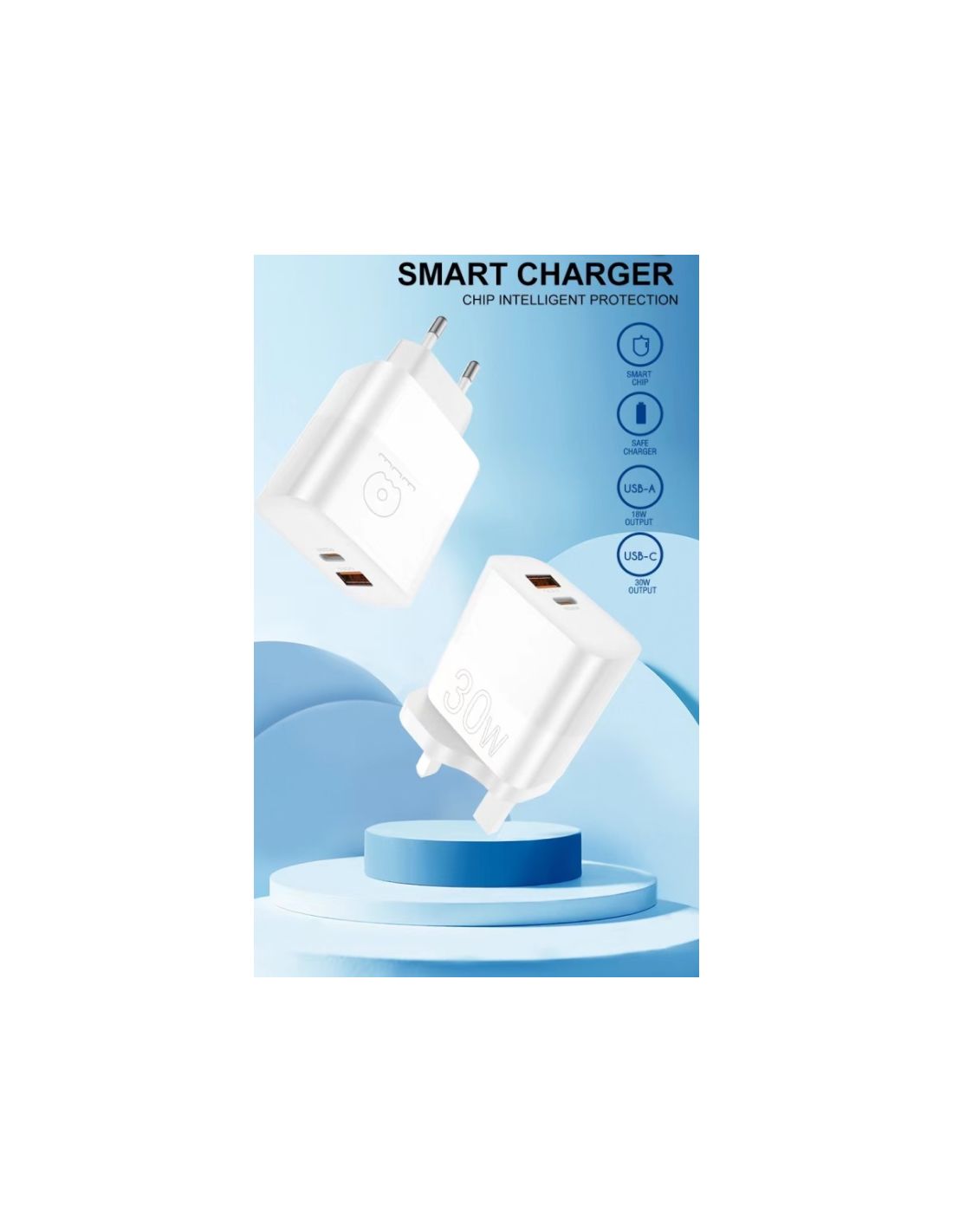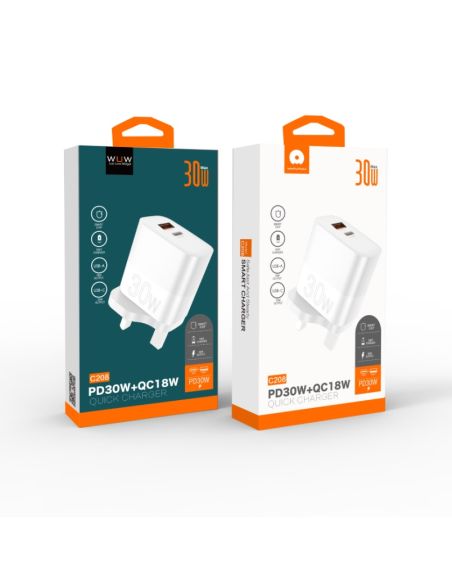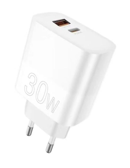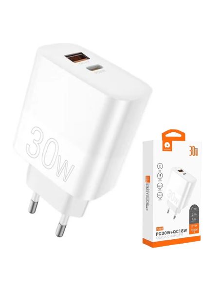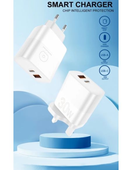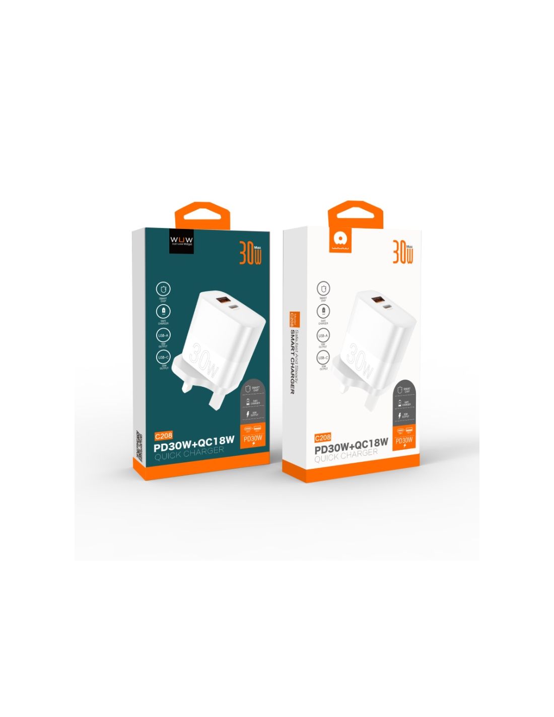 WUW C208 Chargeur mural, sortie USB-A30W + Type C, Prise UE, prise en charge des protocoles de charge Rapide. grâce auquel vous pouvez charger deux gadgets en même temps. Le système de protection intégré à plusieurs niveaux contre les surtensions et les courts-circuits rend l'utilisation de la charge absolument sûre et élimine également la possibilité de surcharger les gadgets rechargeables. L'accessoire est compatible avec la plupart des appareils mobiles existants. En l'utilisant, vous pouvez être absolument sûr de sa qualité et de la sécurité de vos appareils.Le chargeur WUW-C208 est équipé d’un port d’alimentation USB-C et d’un port de charge rapide USB-A. 30W PD USB-C + USB QC3.0 18W Il prend en charge la plupart des protocoles de charge : 3.0, QC 3.0/2, FCP, AFC, de sorte que vous pouvez charger rapidement deux appareils, tels que le téléphone portable et la tablette, en même temps. DISTRIBUTION INTELLIGENTE DE L’ÉNERGIE Le chargeur WUW-C208 offre une puissance maximale de 30W (USB-A – 18 W, USB-C – 30 W) et vous aide à travailler efficacement et de manière flexible. FIABLE ET COMPACT Le chargeur WUW-C208 avec système de protection intégré peut protéger l’appareil connecté contre les courts-circuits, les surchauffes, les surintensités.Le chargeur mural WUW C208 est un adaptateur de haute qualité qui deviendra un assistant fiable dans la charge rapide et sûre de vos appareils. D’une puissance totale de 30W, ce chargeur offre aux utilisateurs deux sorties : l’une USB Type-C avec prise en charge USB Power Delivery, et l’autre USB Type-A compatible avec Quick Charge 3.0. Cette combinaison fait du WUW C208 un choix idéal pour charger les smartphones et les tablettes modernes.
