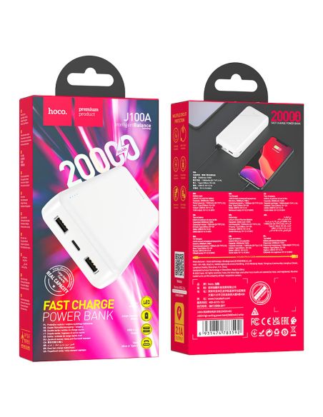 J100A Banque d’alimentation mobile de haut rang, 20000mAh, entrée Type-C unique et entrée Micro-USB simple, sortie USB-A double