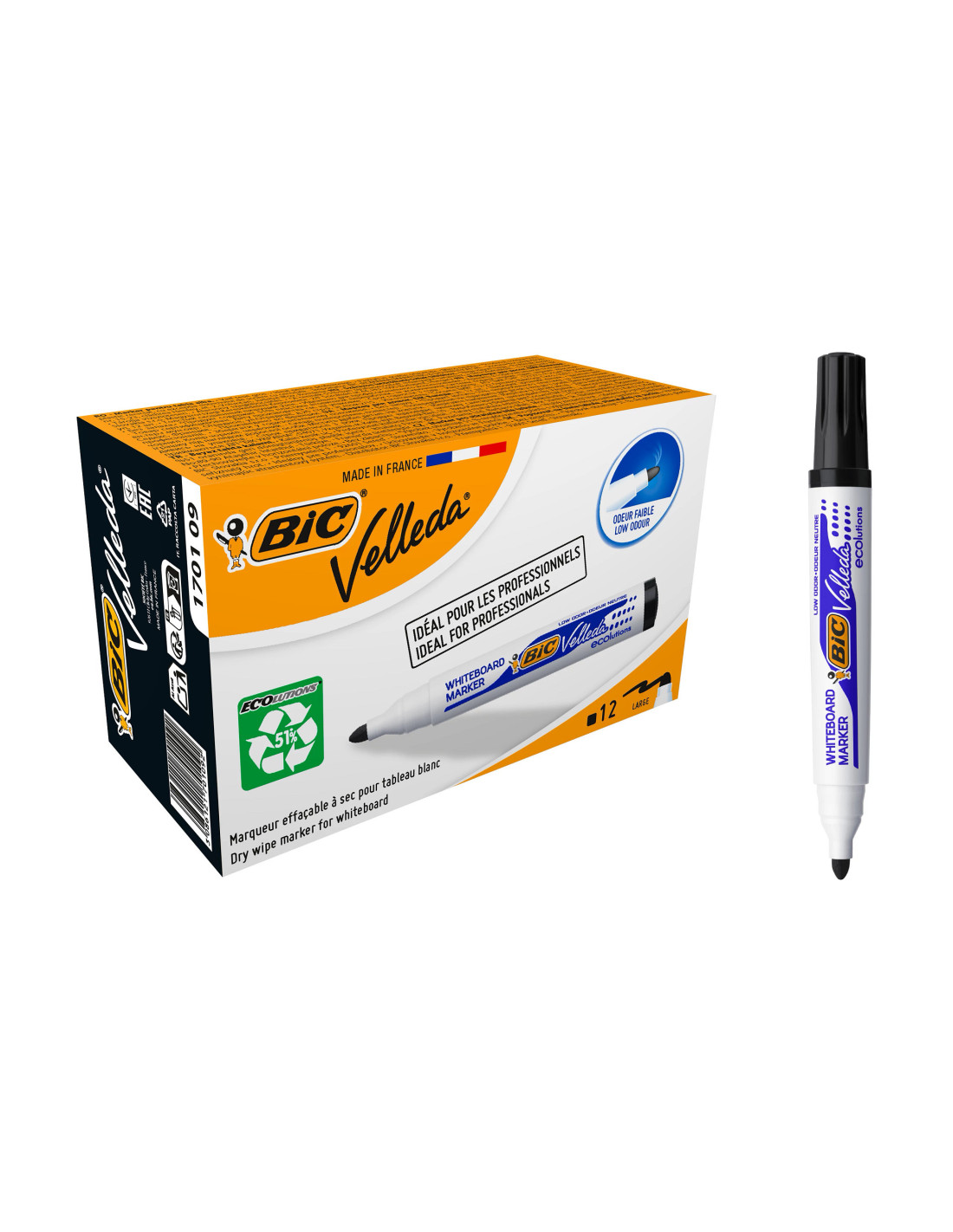 Idéal pour les professionnels, ces 12 feutres effaçables à sec BIC Velleda 1701 présentent les informations avec clarté et style. Leur pointe ogive bloquée crée un trait épais et propre qui intensifie l'écriture, et résiste à la pression sur les tableaux blancs. Leur encre s'efface à sec très facilement même après plusieurs jours et dégage peu d'odeur. Idéal si vous écrivez longtemps. Ces feutres écrivent en vert, leur capuchon et embout assortis sont là pour vous l'indiquer. Ils sont fabriqués en France avec 51% de matière recyclée (à l'exception du système d'encre).