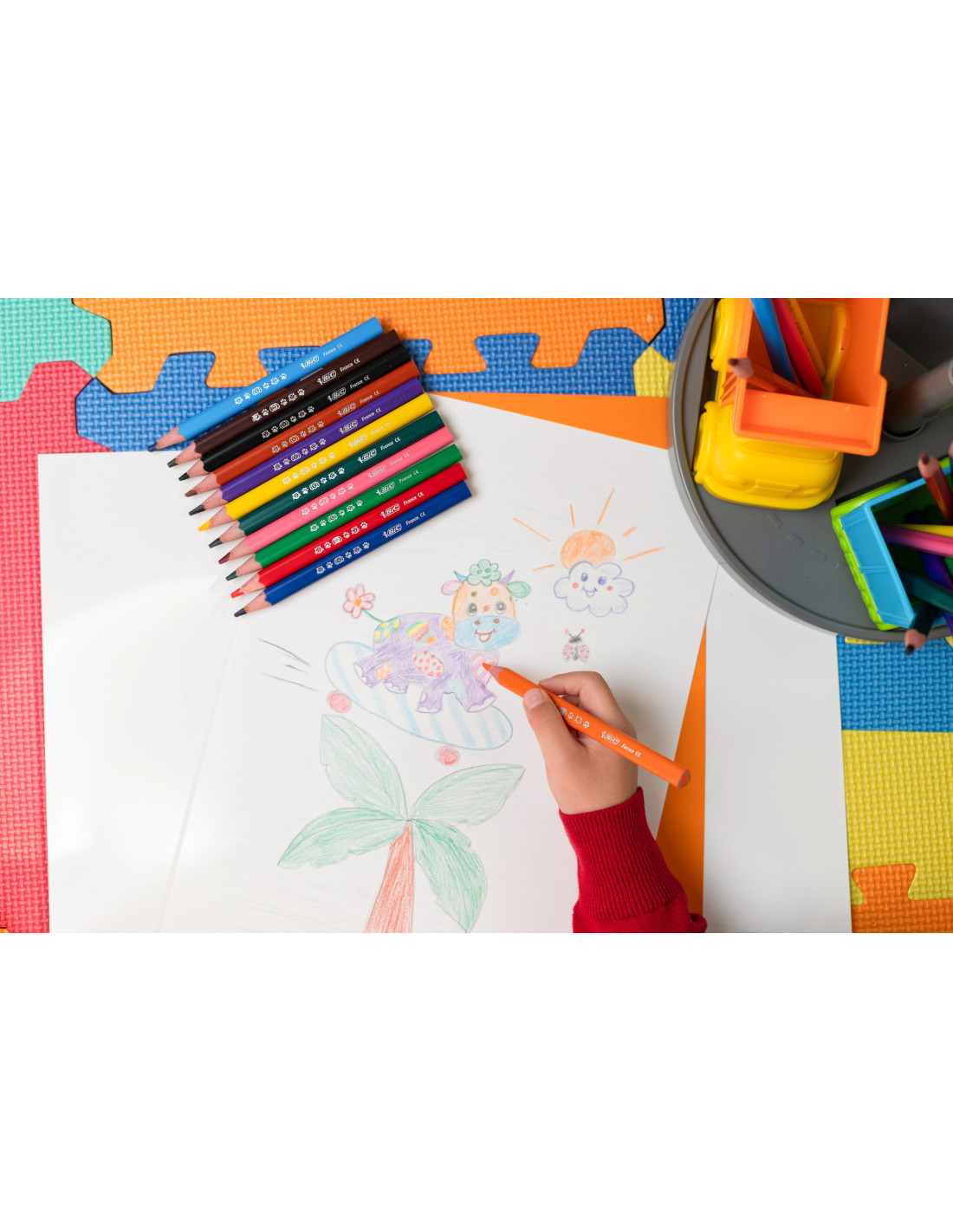 La forme triangulaire des crayons de couleur BIC Kids Evolution Triangle est spécialement conçue pour les enfants dès 2 ans Il contient 12 crayons de couleurs vives à mines extra-larges pour colorier des zones larges en un rien de temps La mine ultra-durable résiste aux chocs, pour moins de mines cassées et plus de temps de coloriage sans frustration pour les enfants Fabriqués sans bois, ces crayons sont résistants au mordillage et sans échardes en cas de casse Composé d'une mine de 4,3 mm en moyenne, à base de pigments pour un fort pouvoir couvrant.