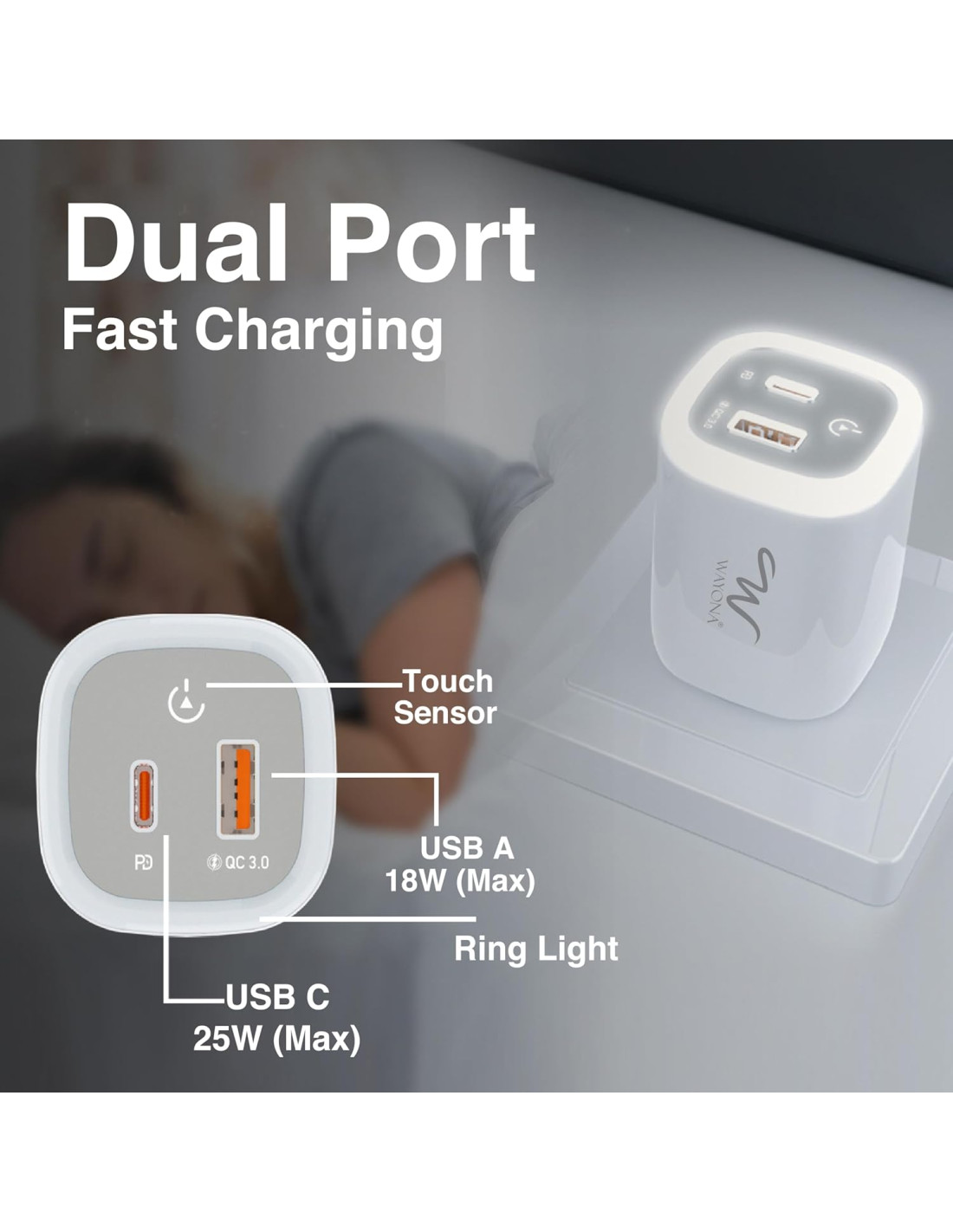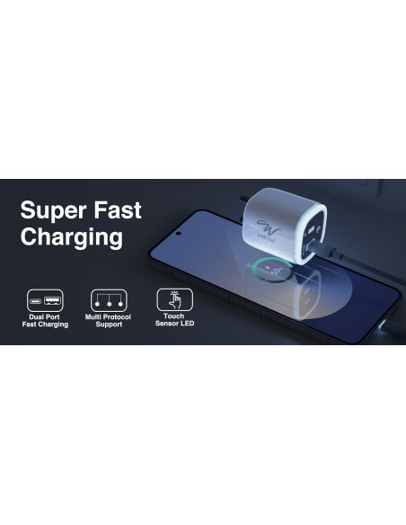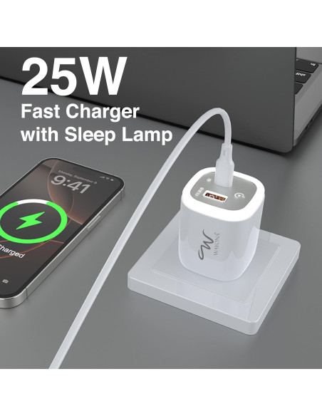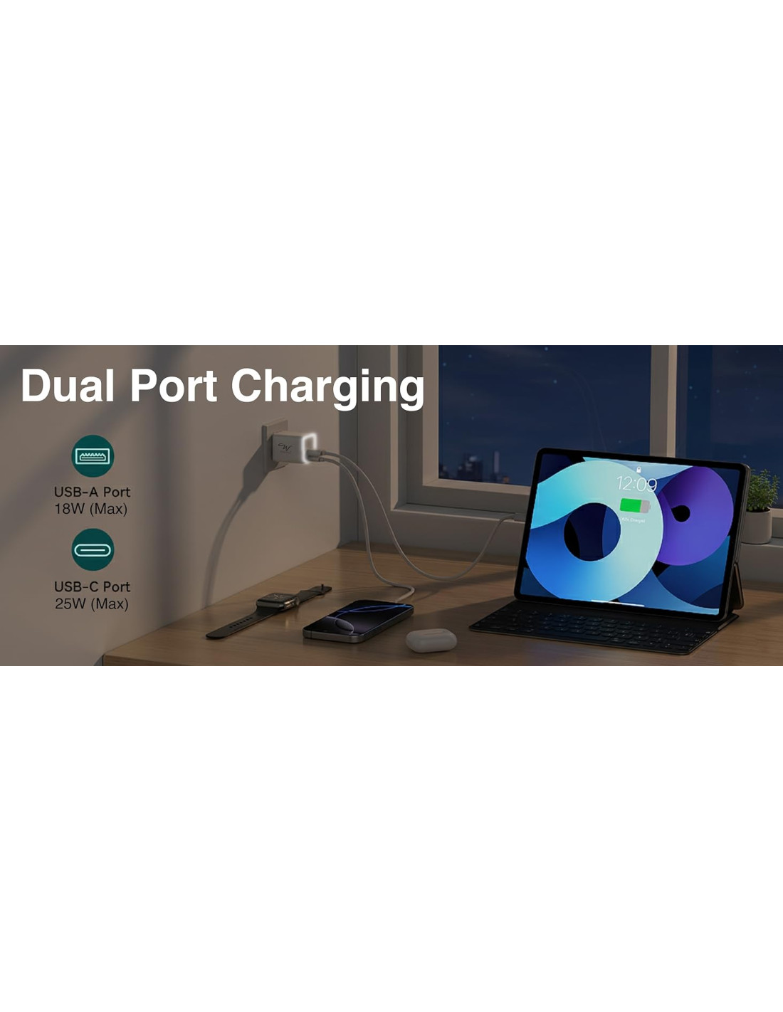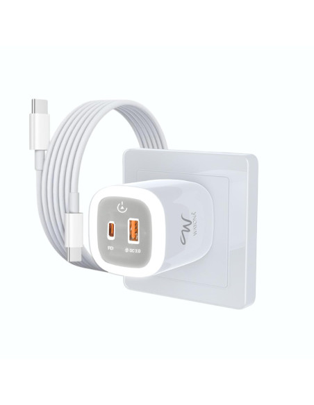 Chargeur Super Rapide avec deux Ports, Muni de Port Type-C super rapide allant jusqu'à 25W et un Port USB Rapide QC 3.0. Avec l'Adaptateur mural à double port vous pouvez Rechargez deux appareils simultanément avec une sortie USB-C + USB-A. Chargeur de voyage parfait ou solution de recharge à domicile pour téléphones, tablettes et divers accessoires.