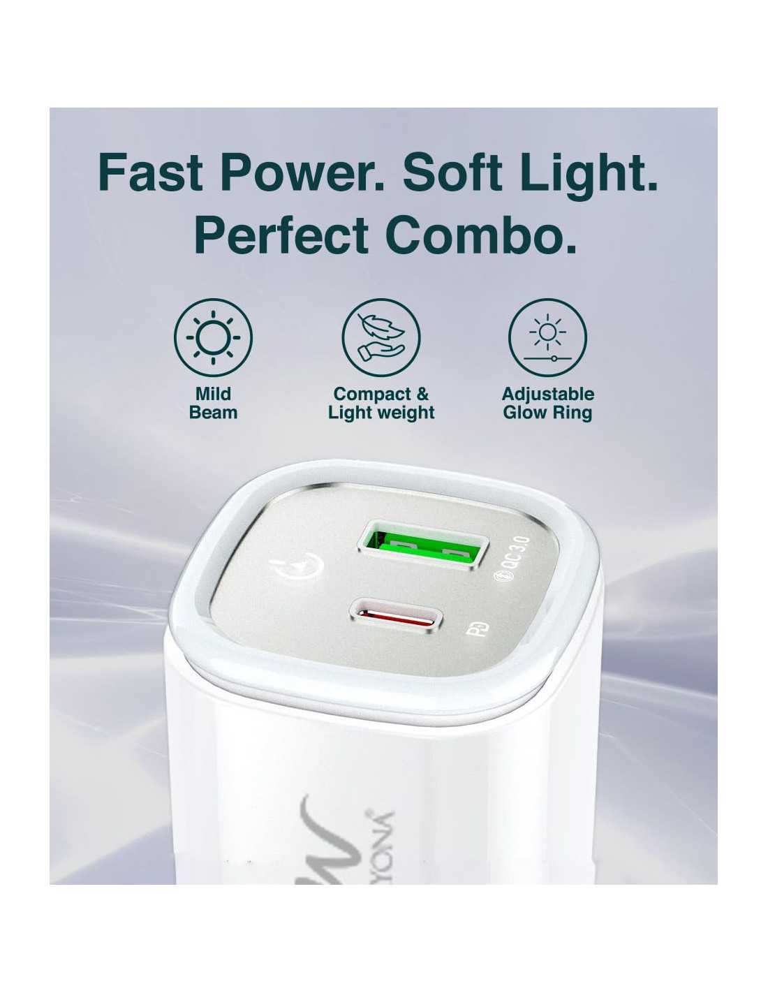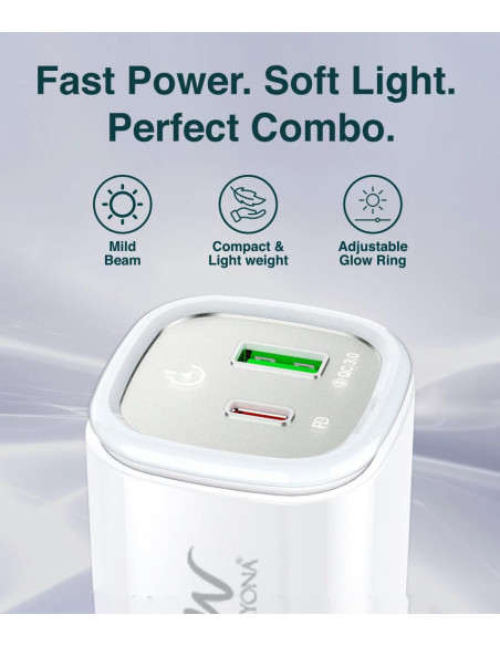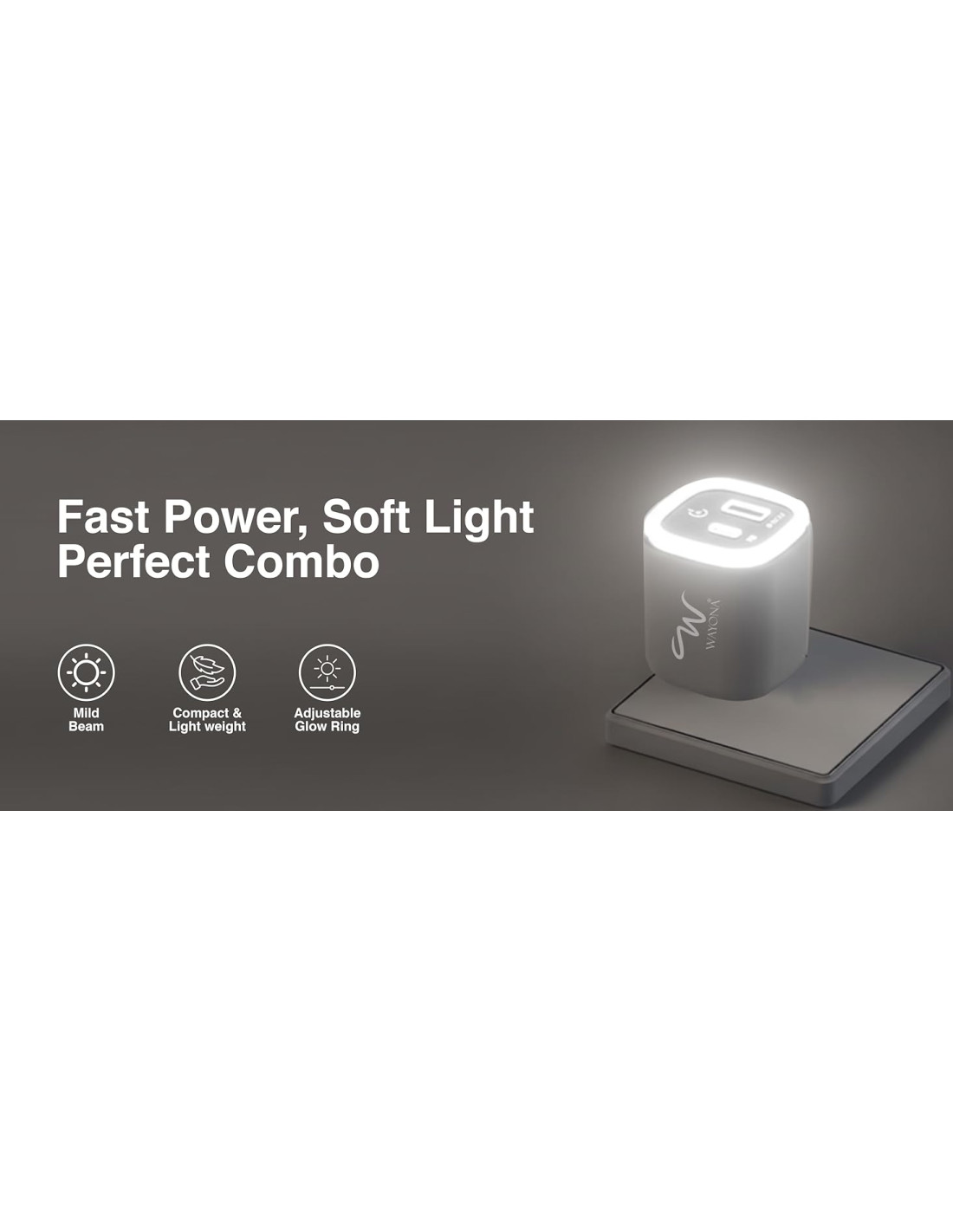 ???? Muni Aussi d'une Veilleuse LED Ring – Lumière LED halo unique à 360° autour du chargeur avec réglage de luminosité. Utilisez-la comme une lampe de nuit subtile ou gardez-la tamisée pour éviter les dérangements pendant le sommeil.