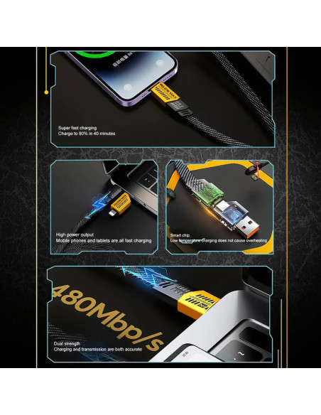Avec une longueur de 1,2 mètre, il offre une flexibilité pour le placement de l’appareil pendant la charge, et sa construction durable assure une résistance aux emmêlements, aux flexions et à l’usure. Ce câble permet la charge rapide et le transfert de données stable (lorsqu’il est compatible), ce qui le rend adapté aux smartphones, tablettes, appareils Bluetooth, batteries externes et autres appareils alimentés par USB. Son design compact et pratique maintient votre espace de travail organisé tout en maintenant vos appareils alimentés.