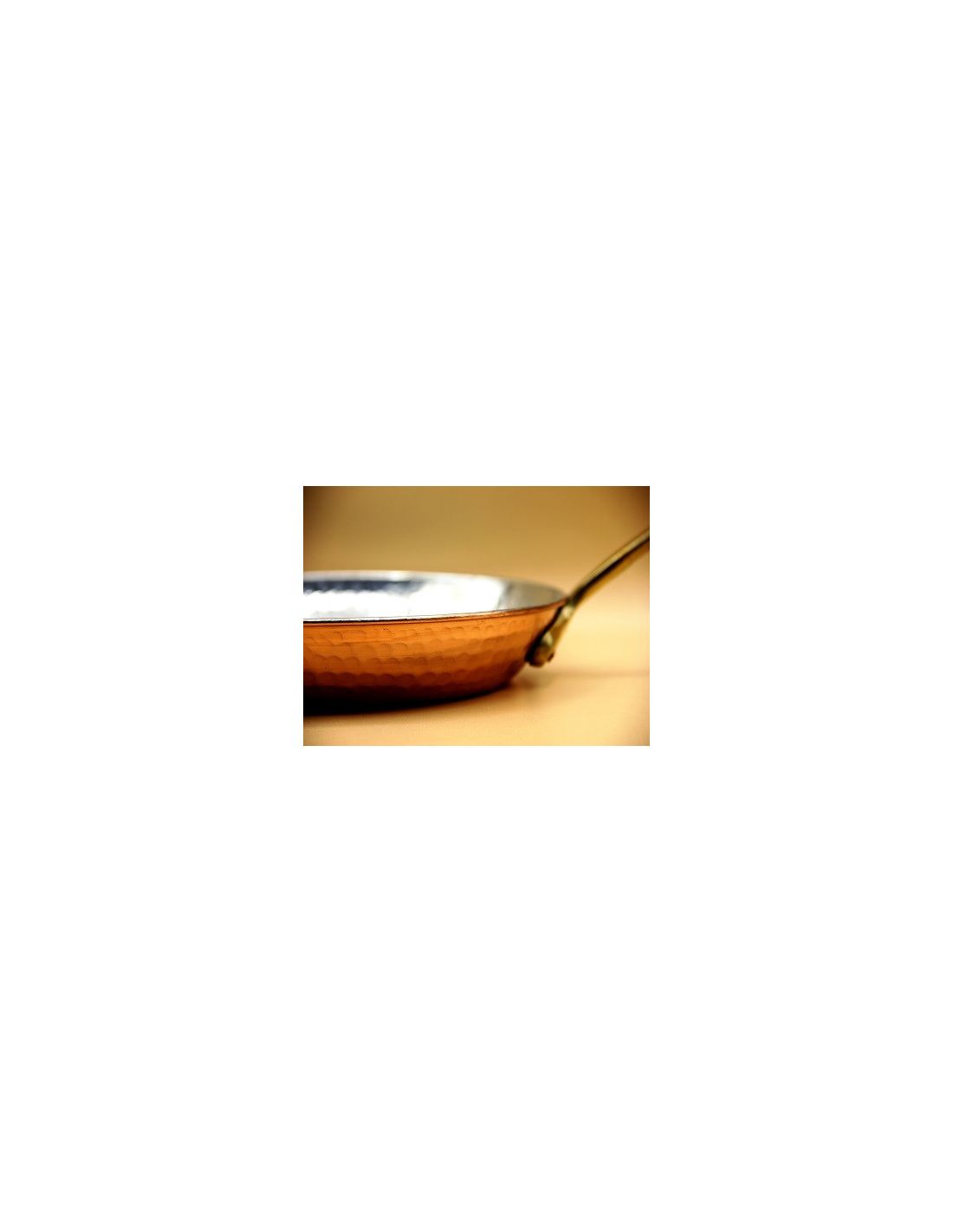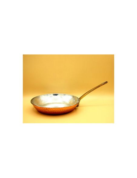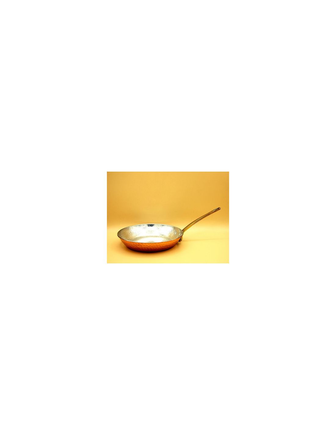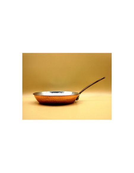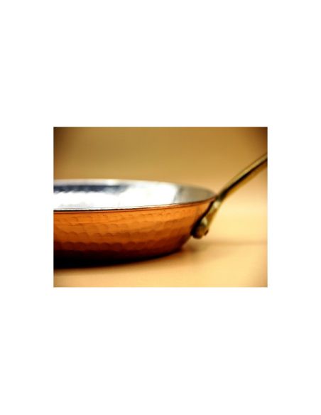 Hand-hammered and tin-plated pink copper frying pan with brass handles that do not transmit heat.