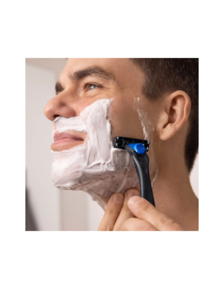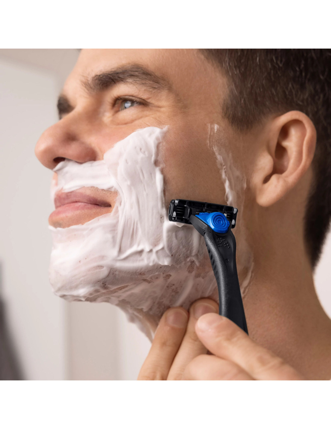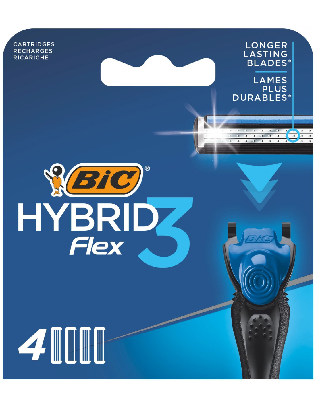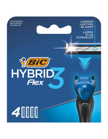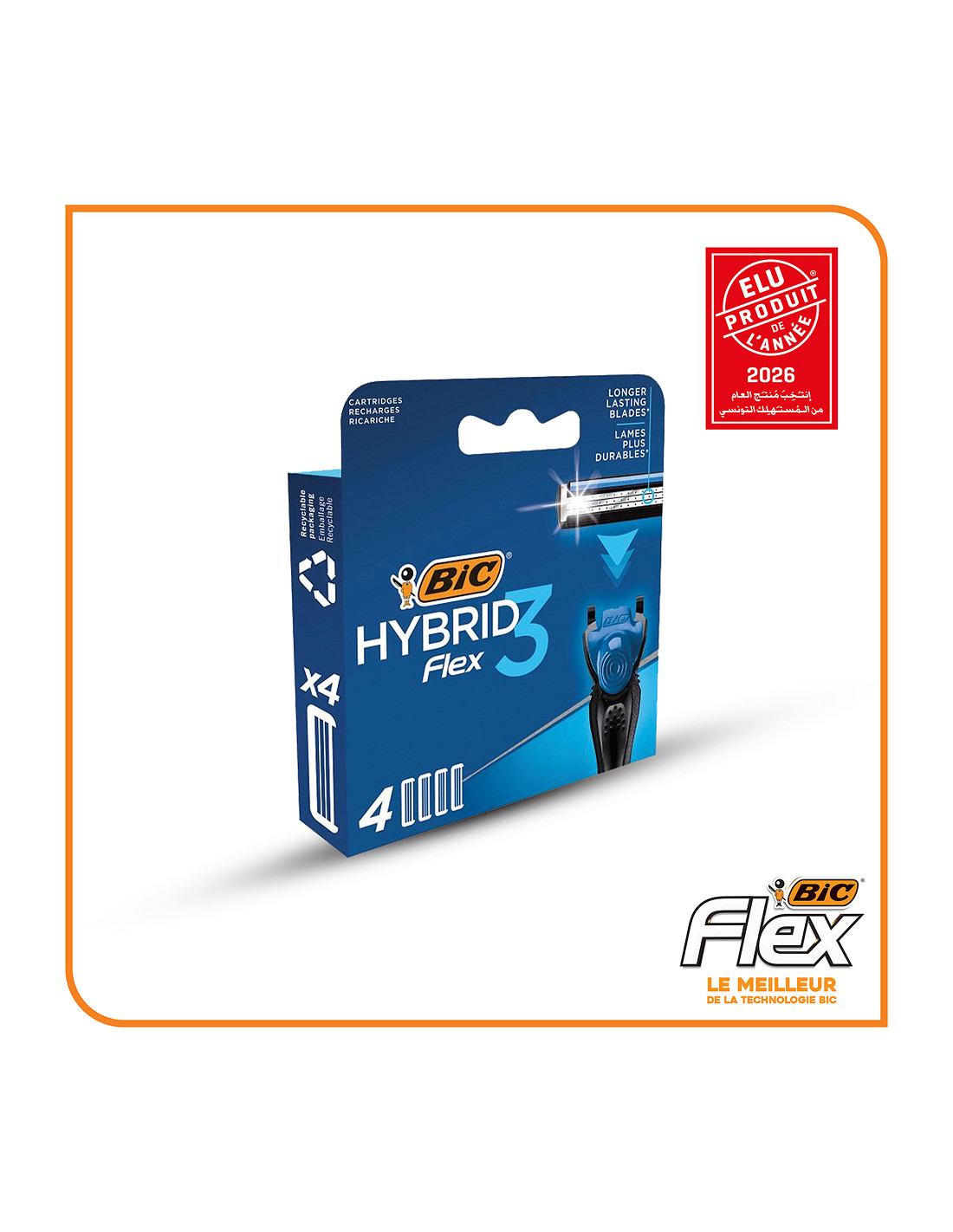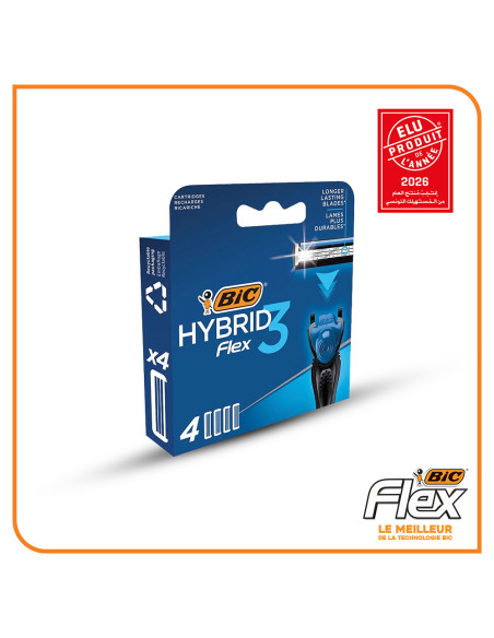 Le BIC Hybrid 3 Flex est un rasoir pour homme doté de trois lames mobiles en titane pour un rasage de près et durable. Il est rechargeable, incluant un manche fait de plastique recyclé et quatre recharges, soulignant son engagement pour une meilleure durabilité des lames. Son emballage est également recyclable, offrant une solution de rasage performante et respectueuse de l'environnement.