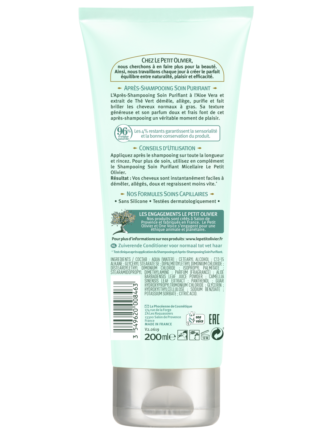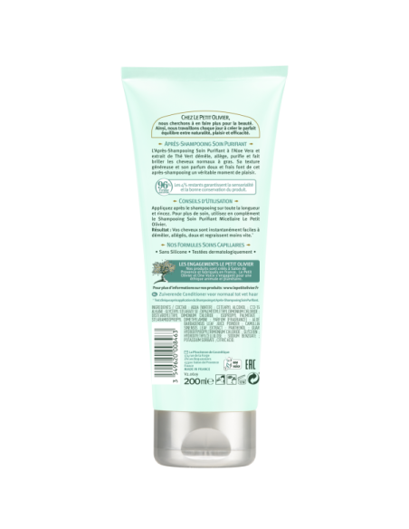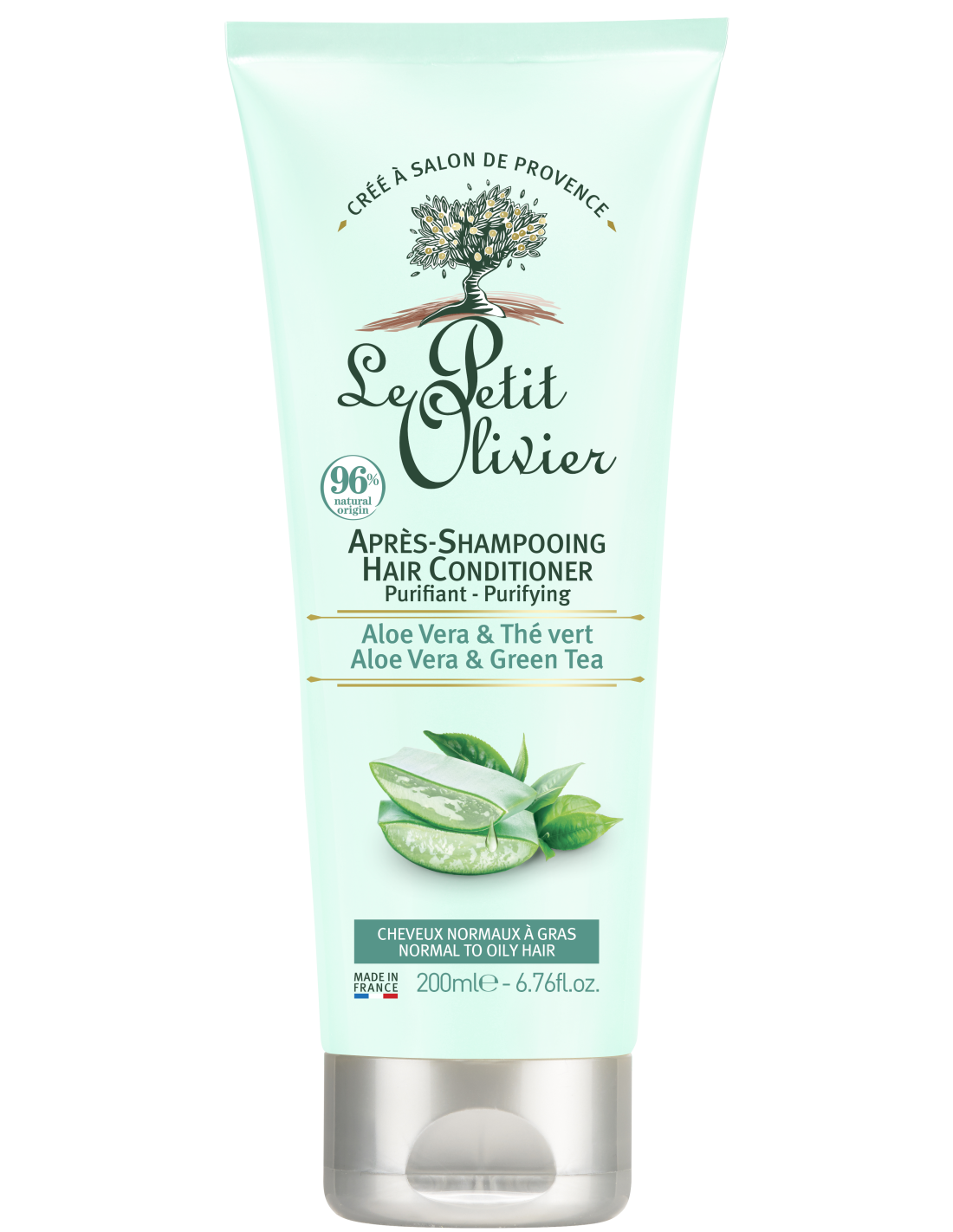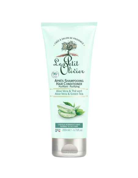 Démêle, purifie et allège les cheveux normaux à gras. Formule sans silicone, enrichie en Aloe Vera et Thé Vert. 96% d'origine naturelle.