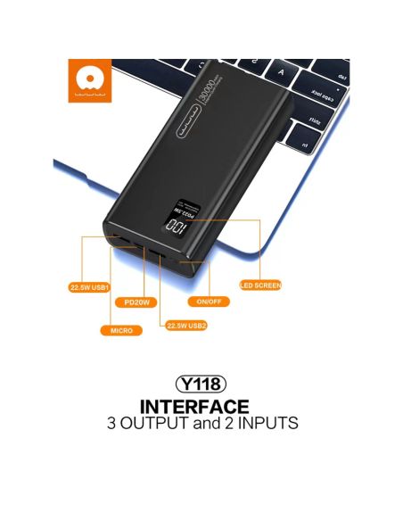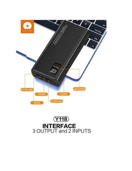 Batterie portable Power Bank WUW Y118 30000mAh PD20W+QC3.0 22.5W LED display Fast Charging est une batterie puissante avec une grande capacité de 30000 mAh, une apparence élégante et de nombreux ports qui vous permettent de récupérer l’énergie de plusieurs appareils en même temps. Cette alimentation compacte, élégante, innovante et riche en fonctionnalités est fabriquée à partir de matériaux de haute qualité. L’appareil est capable de prendre en charge la plupart des protocoles de charge rapide, qu’il s’agisse d’un ordinateur portable, d’une tablette ou d’un téléphone.Capacité gigantesque Jusqu’à 30 000 mAh d’énergie suffisent pour alimenter de nombreux appareils nécessitant . Avec une telle bouée de sauvetage énergétique, vous n’avez pas à vous soucier de vous retrouver sans votre téléphone lors d’un festival de musique de plusieurs jours ou d’un accident de camping.Conception durable et résistante à l’usure, corps résistant à l’abrasion, agréable à la surface de toucher. La batterie est très légère et pratique pendant le transport, se glisse dans n’importe quel sac ou même poche. La banque d’alimentation charge rapidement et efficacement n’importe quel appareil portable. Système de protection intégré contre : surtension d’entrée et de sortie, surchauffe et chutes de tension, court-circuit, surcharge et décharge complète. Indicateurs LED intégrés qui indiquent le niveau de la batterie.