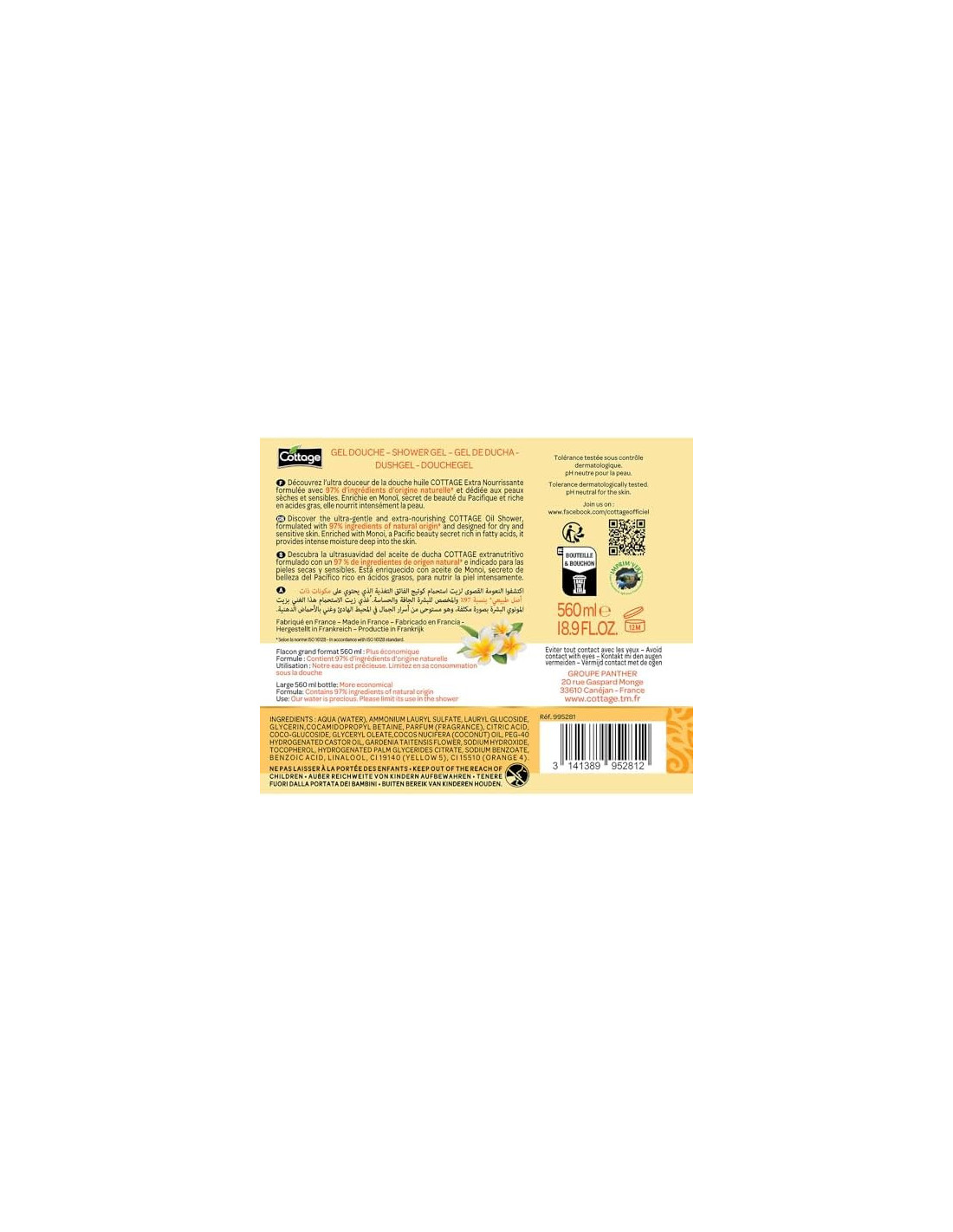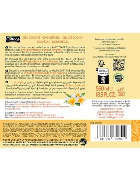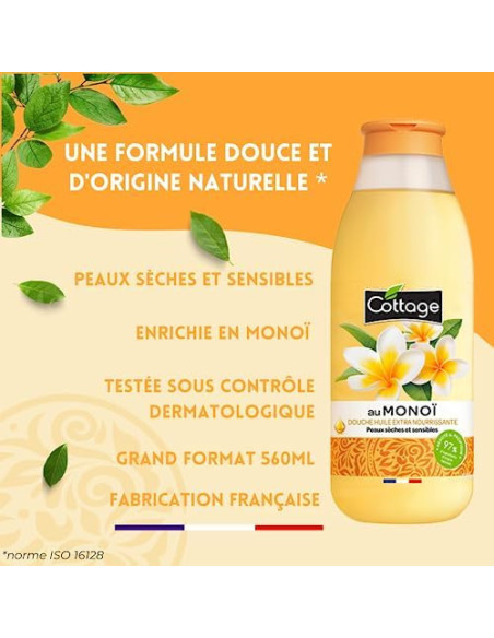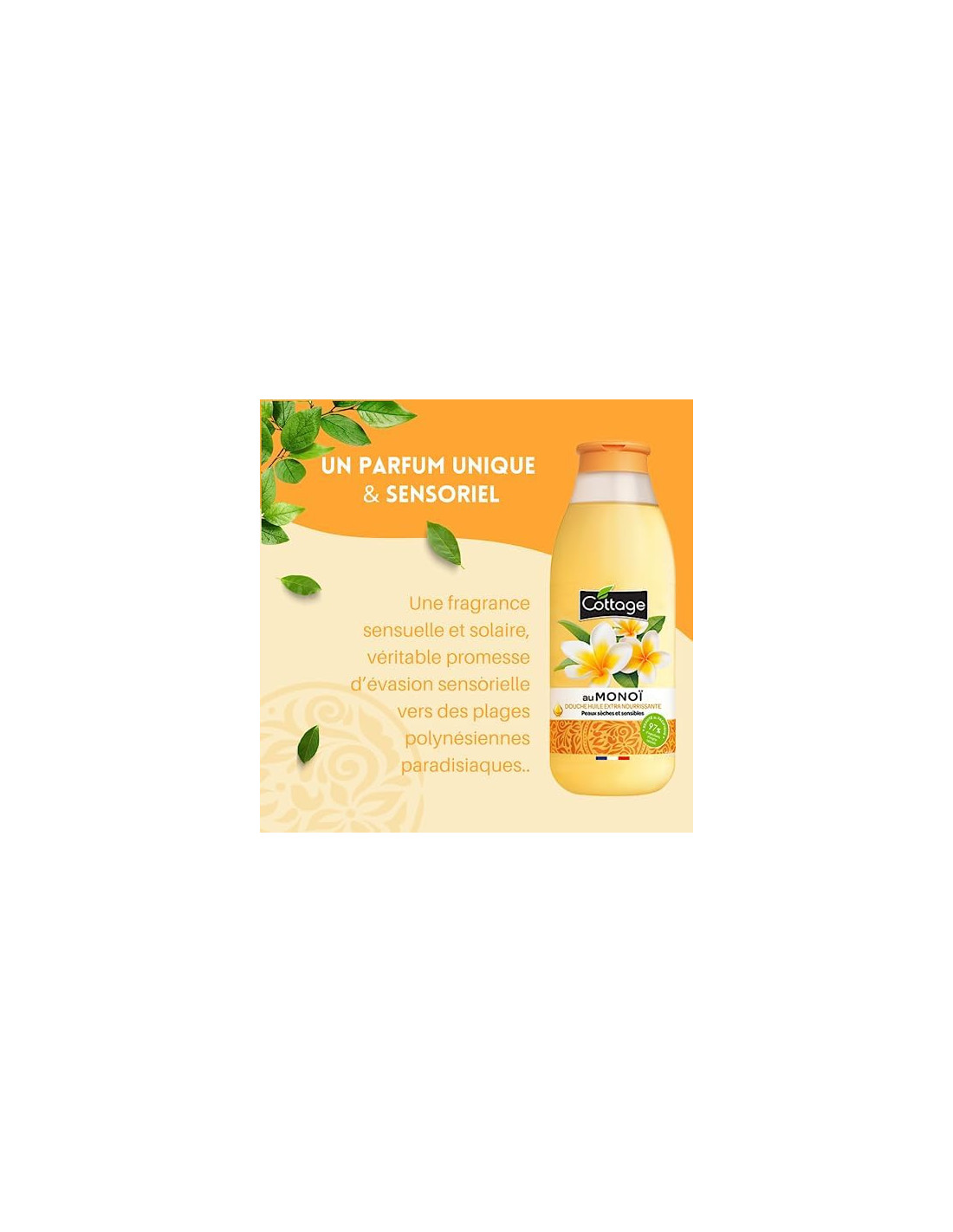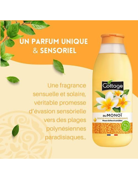 Offrez à votre peau une évasion sensorielle avec cette huile de douche extra-nourrissante au Monoï, inspirée des plages polynésiennes. Spécialement formulée pour les peaux sèches et sensibles, elle contient 97 % d’ingrédients d’origine naturelle, nettoie sans laisser de film gras, pH neutre, biodégradable, fabriquée en France. [fr.Cottage.tm.fr]