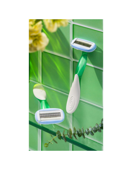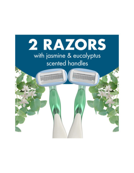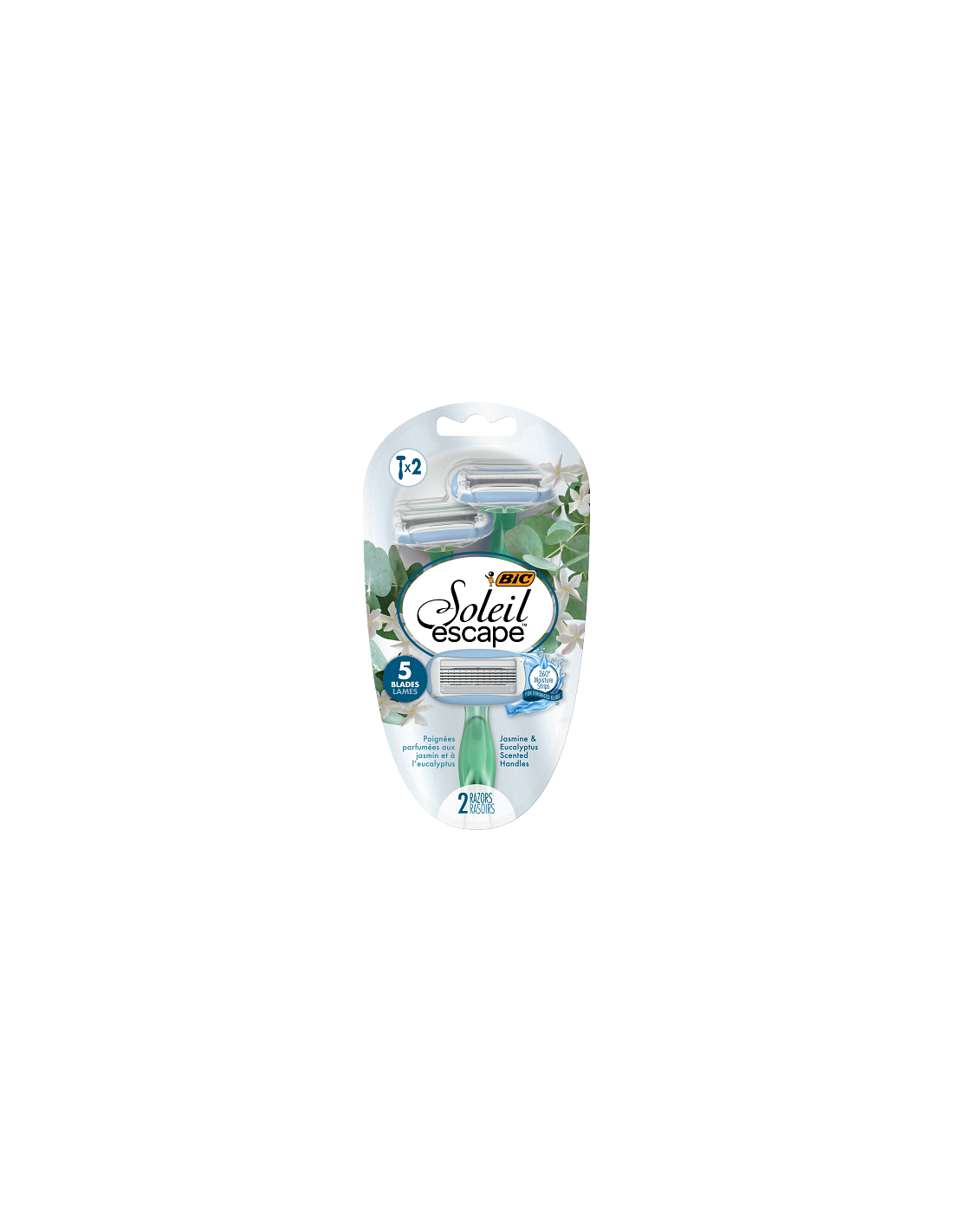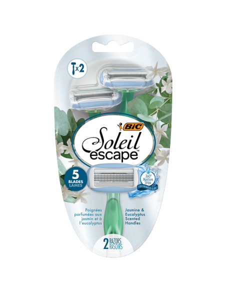 Le BIC Soleil Escape Jasmin est un rasoir pour femmes doté de 5 lames pour un rasage de près et en douceur. Ses poignées sont infusées d'un parfum délicat de jasmin et d'eucalyptus, offrant une expérience sensorielle agréable pendant le rasage. Ce blister contient deux rasoirs, chacun avec une bande hydratante à 360° pour une meilleure glisse.