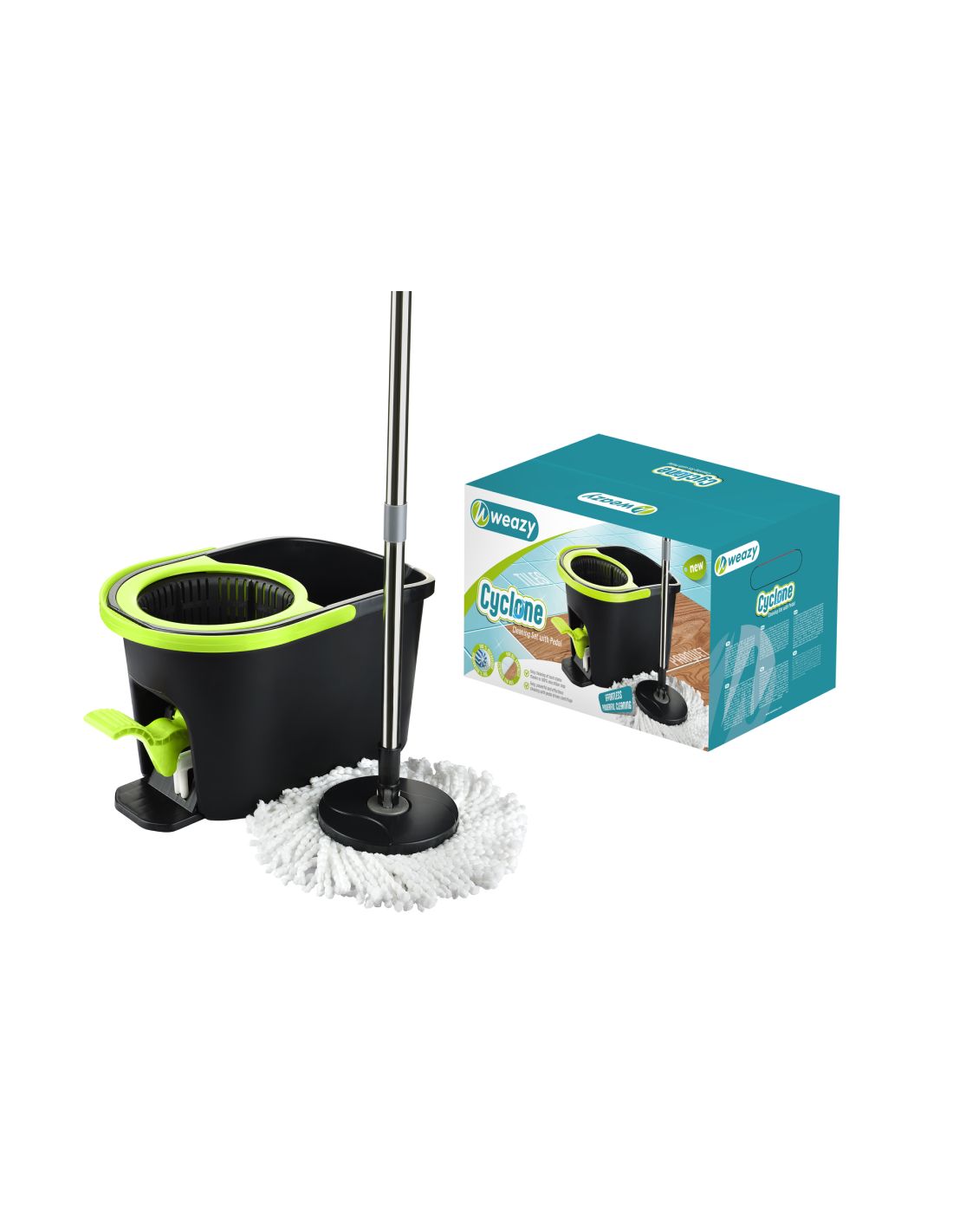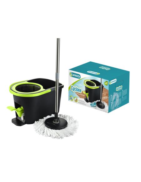 The "Weazy Cyclone Cleaning Kit With Mop, 13L Automatic Pedal Operated Wringer Bucket" is a comprehensive cleaning set including a mop with fringes and a 13-liter automatic pedal-operated wringer bucket. With its rotating drying mechanism for the mop, this set provides efficient and convenient floor cleaning without hassle.
