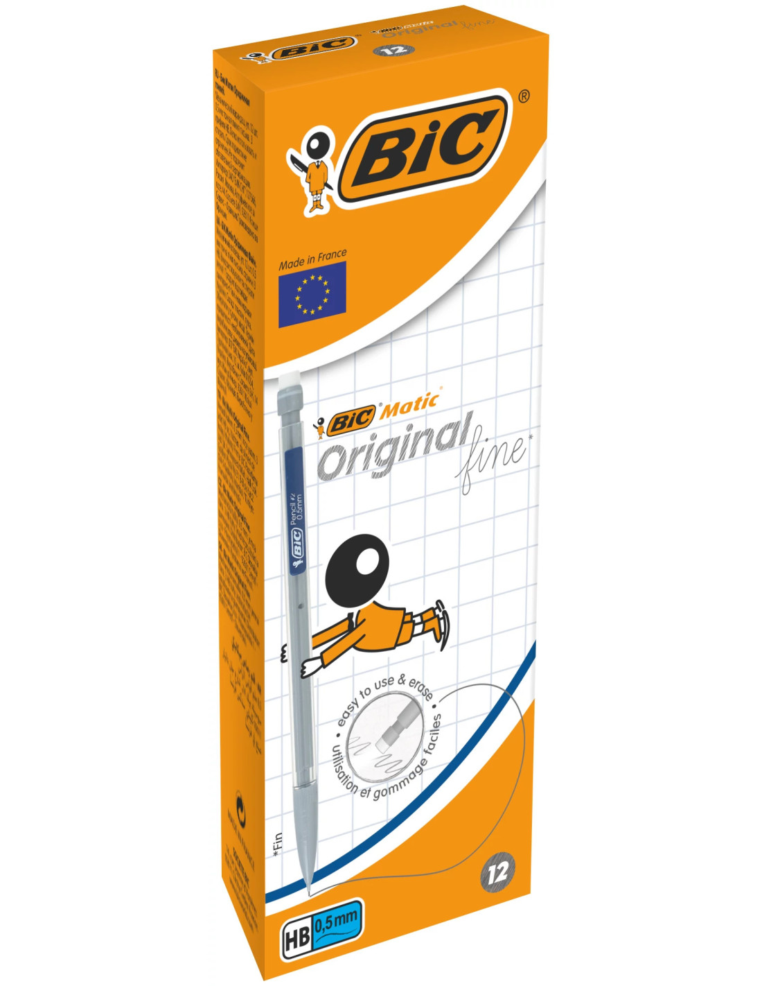 Avec sa mine HB de 0,5 mm, le porte-mines BIC Matic se décline en version fine pour les travaux qui requièrent plus de précision. Fournis avec 3 mines HB de 9 cm, ces 12 portes-mines permetten une écriture fluide et régulière. Grâce à la gomme blanche intégrée, la mine graphite se corrige facilement : idéal pour la prise de notes, le dessin ou les mots croisés. Il partage le design indémodable de son grand frère le crayon BIC Matic Original : un corps hexagonal facile à tenir et un clip coloré. Cocorico, le porte-mines BIC Matic Original Fine est fabriqué en France dans les usines BIC