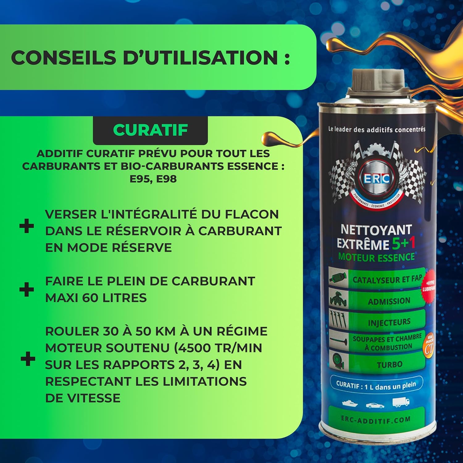 - INTÉRÊT | Le Nettoyant Extrême 5+1 Essence permet de désencrasser immédiatement les 5 organes principaux du moteur et la réduction de la consommation. Compatible à tout type de moteur à Essence et particulièrement efficace pour les moteurs en injection directe, il permet l'utilisation de tout type de carburant Essence. Il réduit les émissions de CO2, protège de la corrosion et stabilise l'eau dans le carburant. Tout en diminuant les bruits de cliquetis de l'arbre à came.