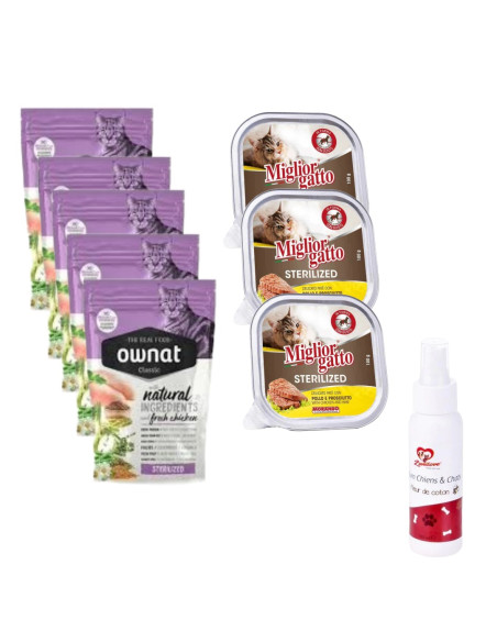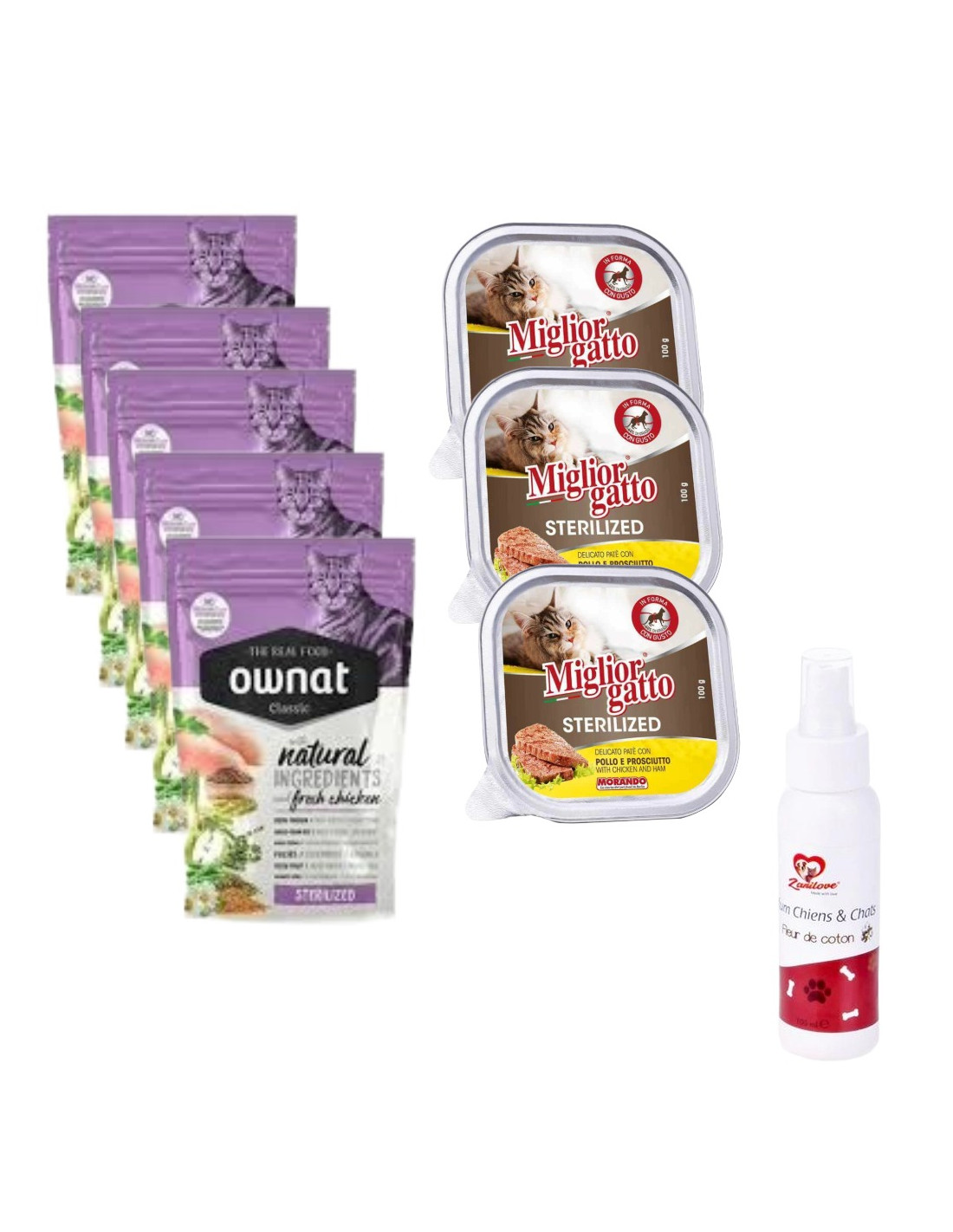 Pack pour chat stérilisé : croquette OWNAT 400gr & Barquette miglior gatto 100gr & parfum zanilove 100ml